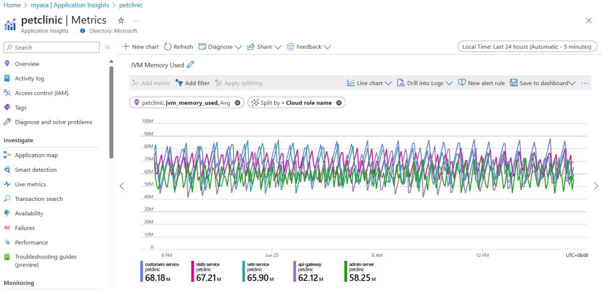 On the navigation menu, select Metrics, select the edit icon in the chart title, and then rename the chart title to JVM Memory Used.