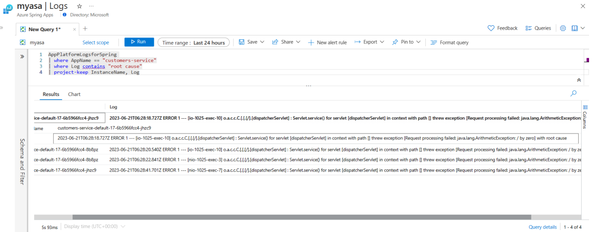This section explains how to query application logs from the AppPlatformLogsforSpring table hosted by Azure Spring Apps. You can use the Kusto Query Language to customize your queries for application logs.
