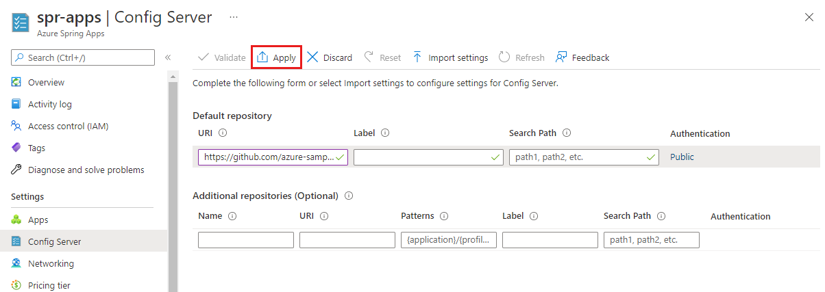 https://github.com/azure-samples/spring-petclinic-microservices-config.Select Validate. Validation checks the schema and accessibility of your git repo to make sure it's correct.