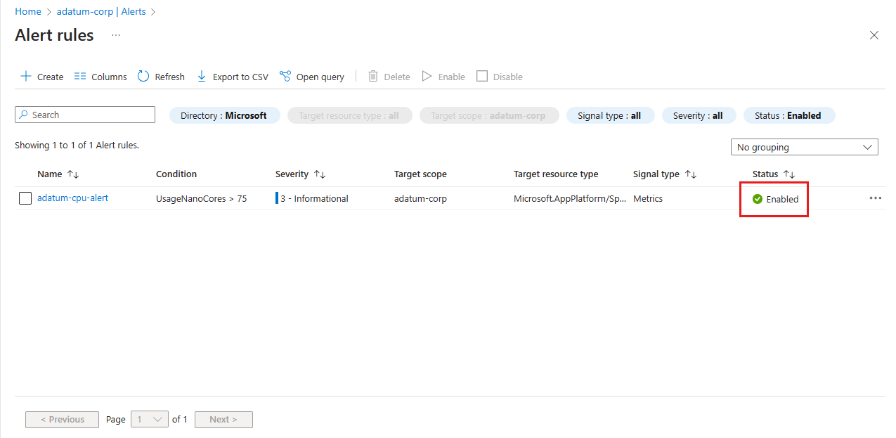 9. On the Alert rules page, verify that the new alert rule is enabled.