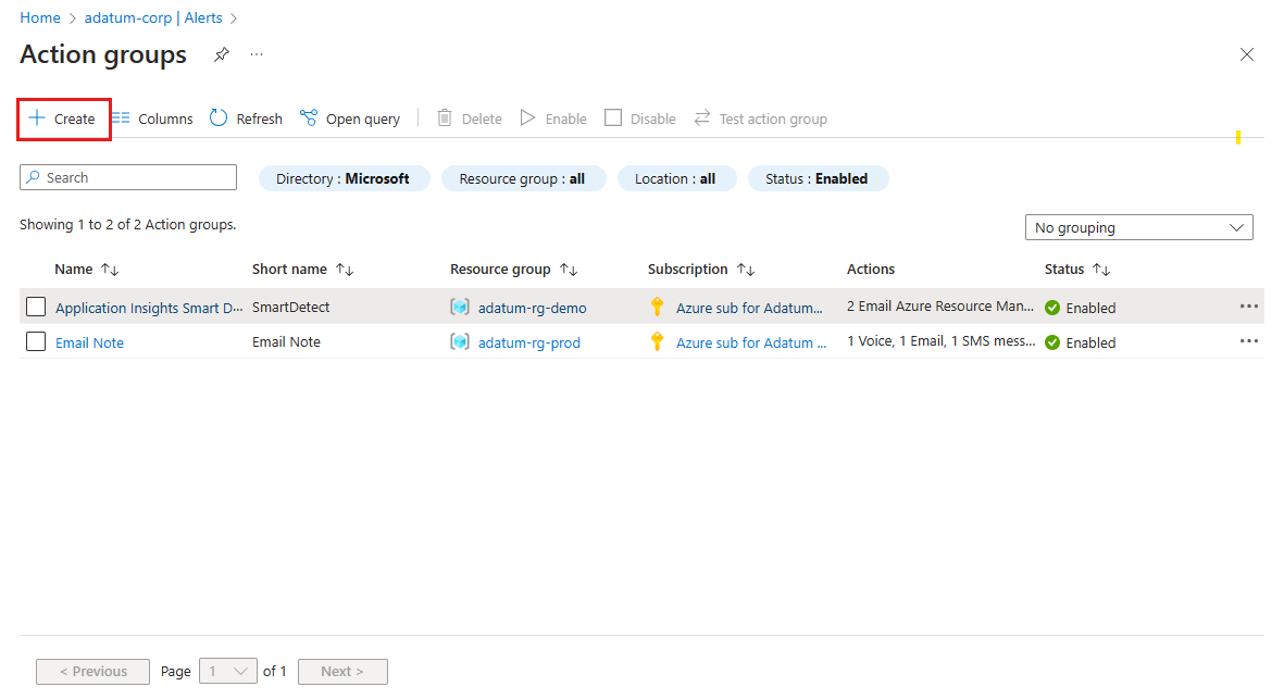3. On the Action groups page, select Create.