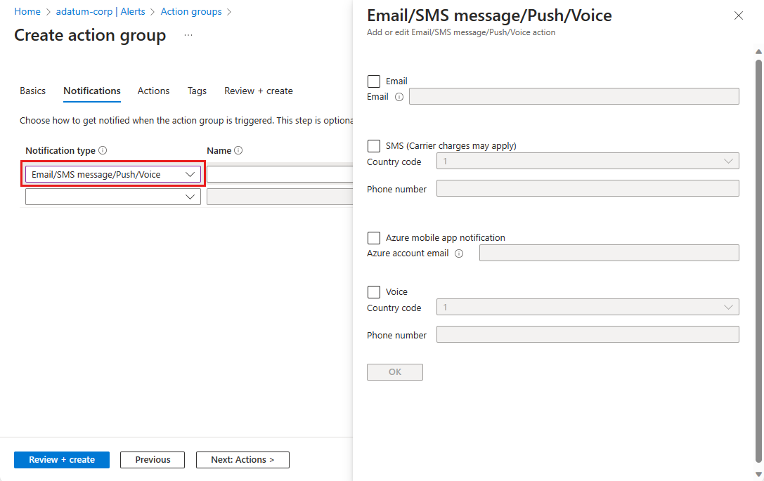 7. Select Review + create to finish creating the action group.