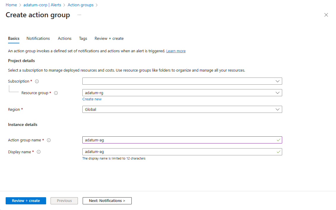 4. On the Create action group page on the Basics tab, make any needed changes in Project details. In Instance details, specify settings for Action group name and Display name.