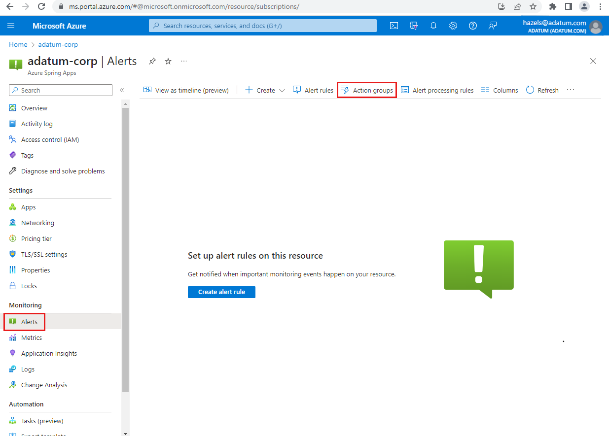 Tutorial: Monitor Spring app resources using alerts and action groups
