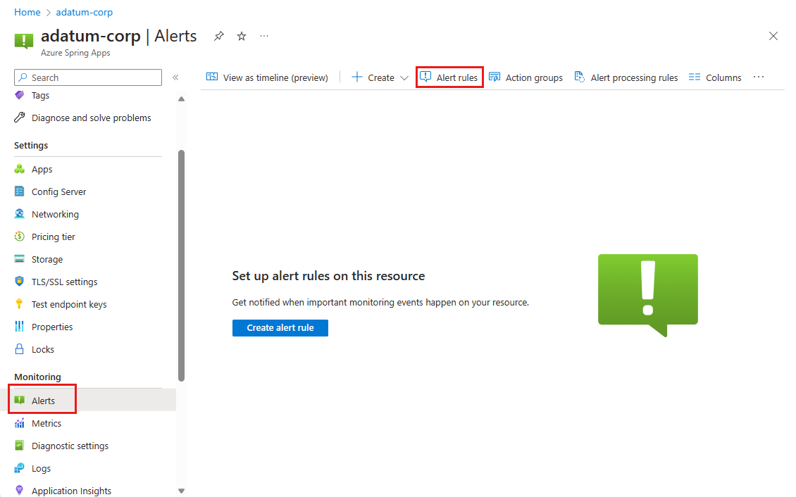 This article describes how to monitor Spring app resources using alerts and action groups in Azure Spring Apps.