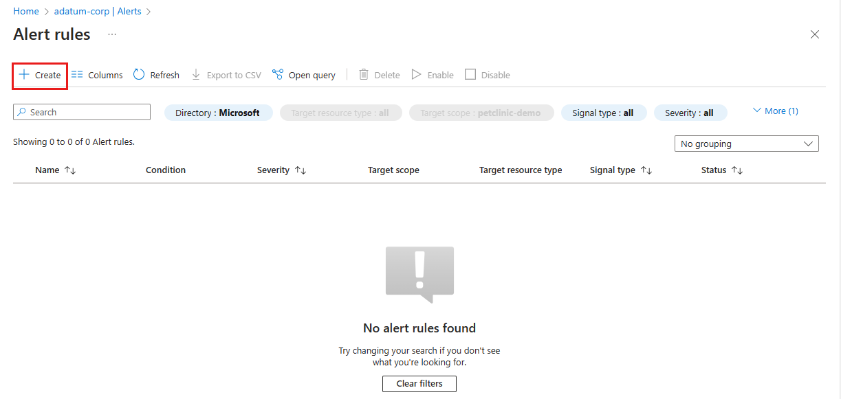 Screenshot of the Azure portal showing the Alert rules page with the Create button highlighted.