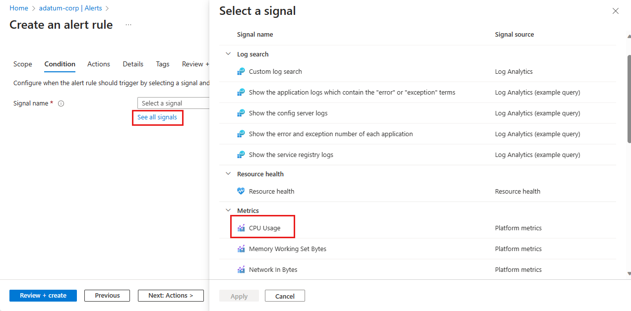 3. On the Create an alert rule page on the Condition tab, you must select a signal to trigger the alert rule. Select See all signals. On the Select a signal pane, select CPU Usage and then select Apply.