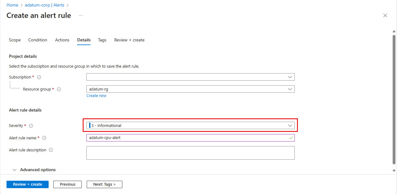 Screenshot of the Azure portal showing the Create rule page with Severity in Alert Details highlighted.