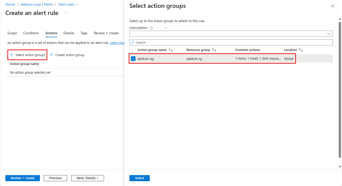 5. Select the Actions tab and then select Select action group. On the Select action groups pane, select the action group that should be triggered by the rule such as the action group you defined previously.