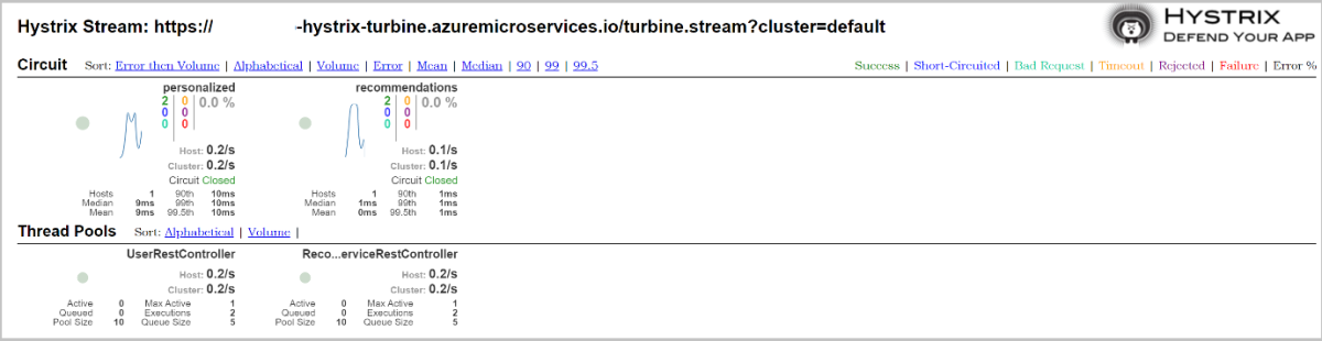 Hystrix metrics streams are also accessible from test-endpoint. As a backend service, we didn't assign a public end-point for recommendation-service, but we can show its metrics with test-endpoint at https://primary:<KEY>@<SERVICE-NAME>.test.azuremicroservices.io/recommendation-service/default/actuator/hystrix.stream