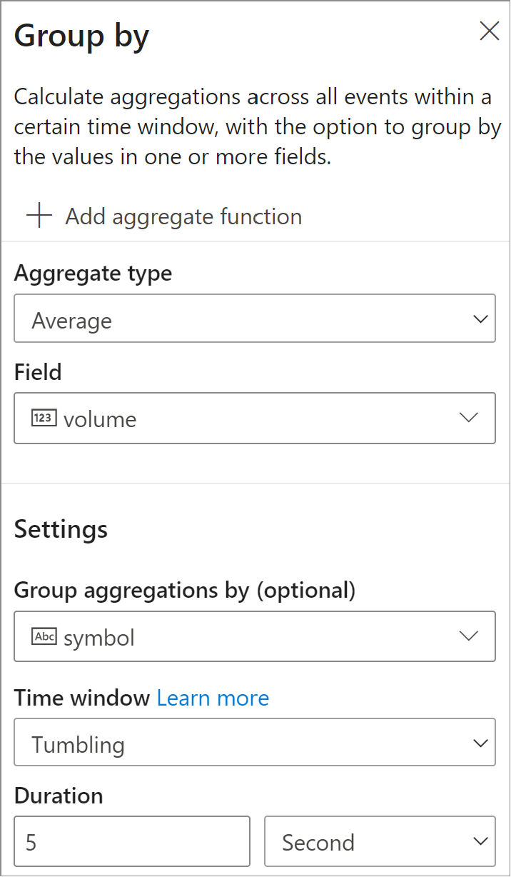 6. In the next step, you specify the field and the aggregate you want to calculate, such as Average and Count. You can also specify the field that you want to Group By along with the time window. Then you can validate the results of the step in the Data preview section.
