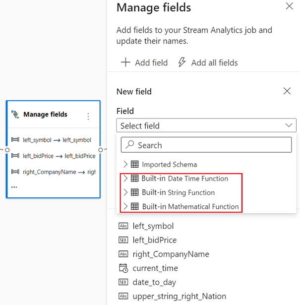 You can also add new field with the Built-in Functions to aggregate the data from upstream. Currently, the built-in functions we support are some functions in String Functions, Date and Time Functions, Mathematical Functions. To learn more about the definitions of these functions, see Built-in Functions (Azure Stream Analytics).