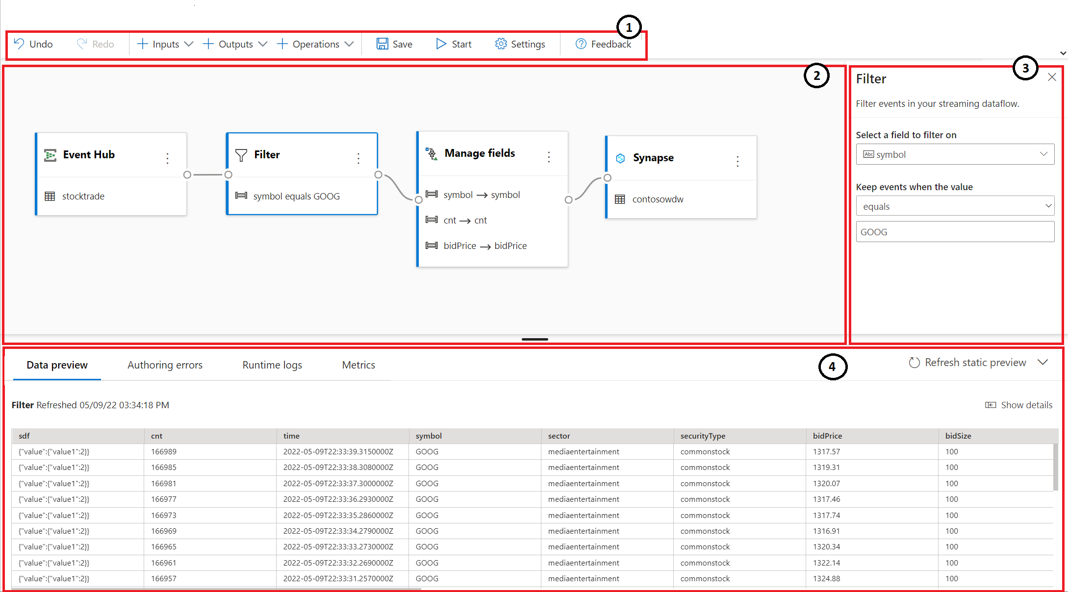 - Tabs for data preview, authoring errors, runtime logs, and metrics: For each tile, the data preview shows you results for that step (live for inputs; on demand for transformations and outputs). This section also summarizes any authoring errors or warnings that you might have in your job when it's being developed. Selecting each error or warning selects that transform. It also provides the job metrics for you to monitor the running job's health.