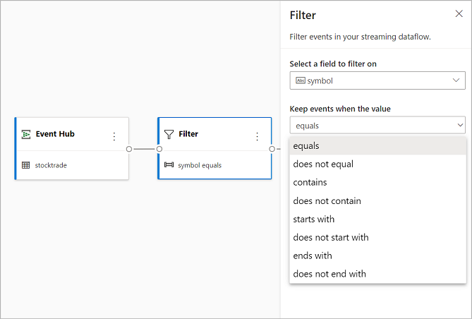 Use the Filter transformation to filter events based on the value of a field in the input. Depending on the data type (number or text), the transformation will keep the values that match the selected condition.