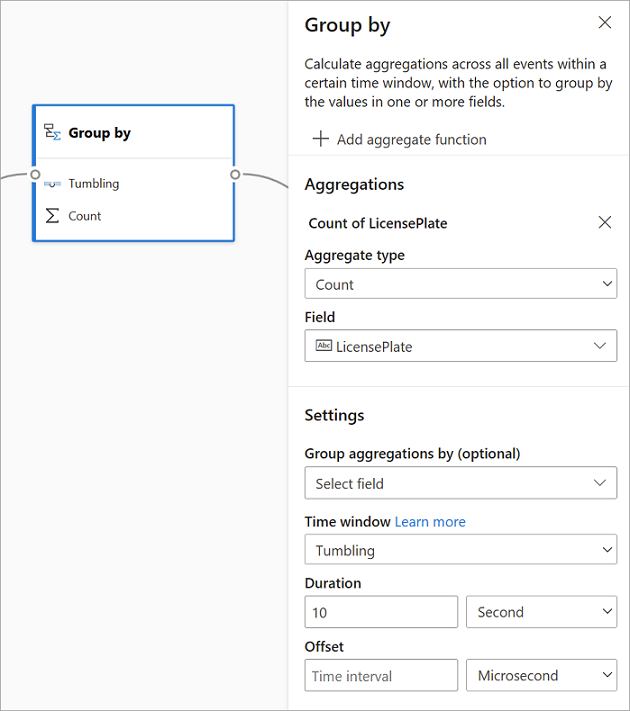 To add another aggregation to the same transformation, select Add aggregate function. Keep in mind that the Group by field and the windowing function will apply to all aggregations in the transformation.