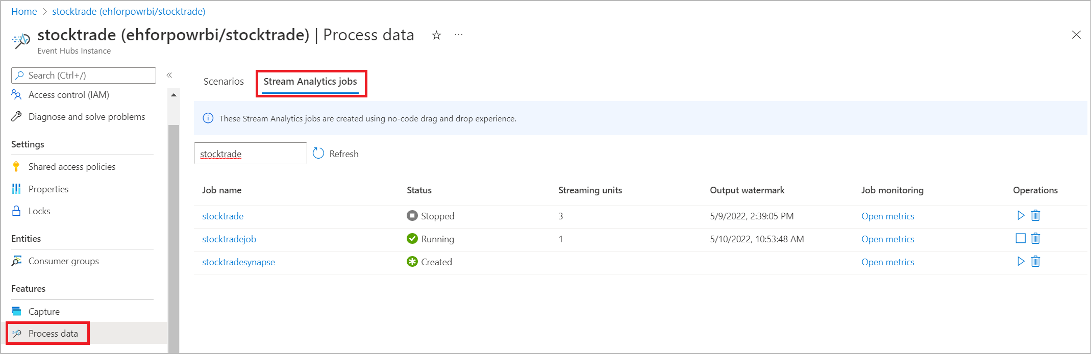 To see a list of all Stream Analytics jobs that you created by using the no-code drag-and-drop experience in Azure Event Hubs portal, select Process data > Stream Analytics jobs.