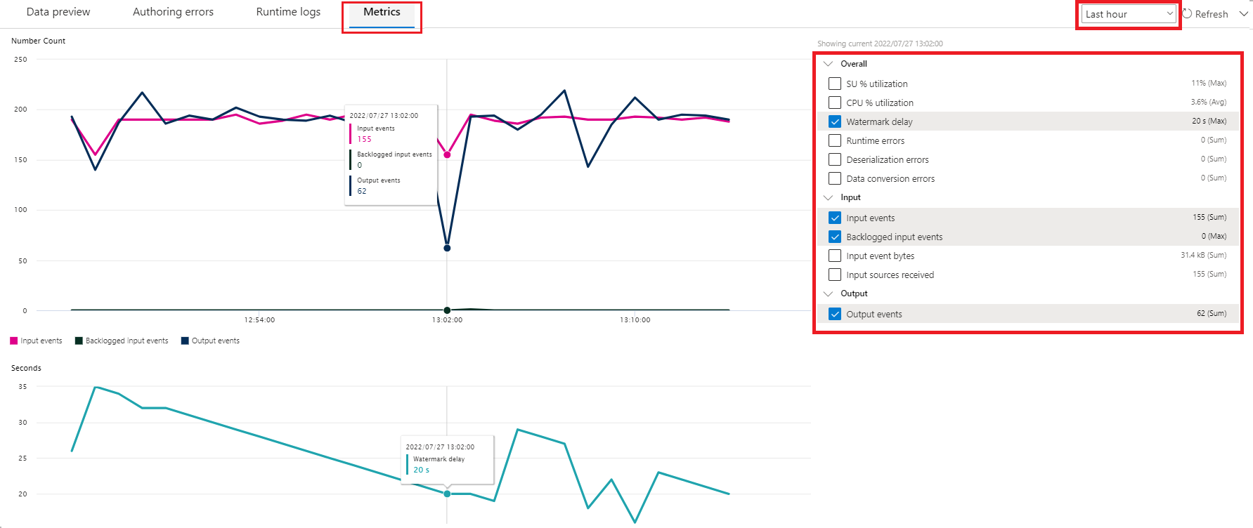 If the job is running, you can monitor the health of your job on the Metrics tab. The four metrics shown by default are Watermark delay, Input events, Backlogged input events, and Output events. You can use these metrics to understand if the events are flowing in and out of the job without any input backlog.