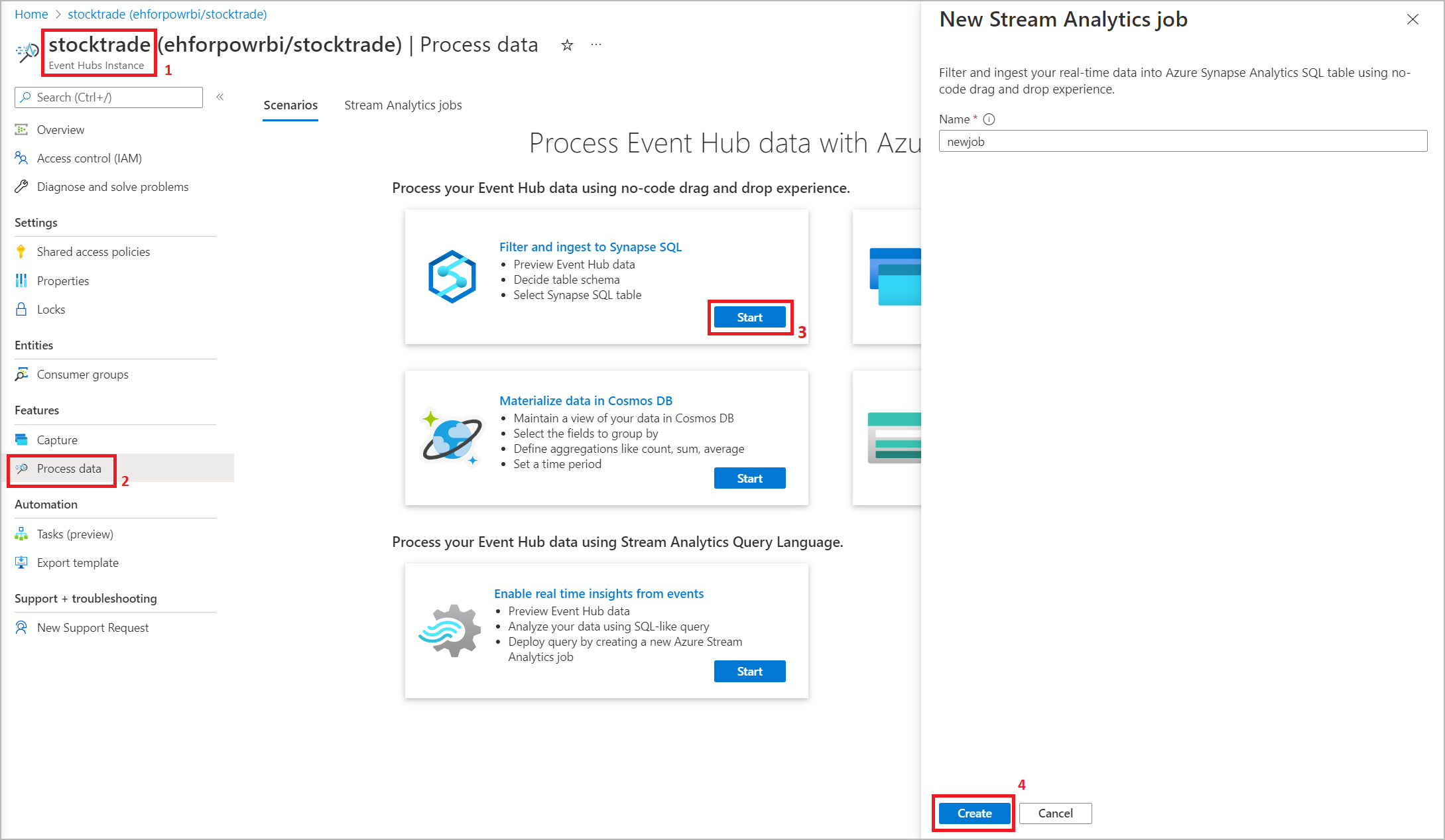 Through Azure Event Hubs portal: Open an Event Hubs instance. Select Process Data, and then select any predefined template.