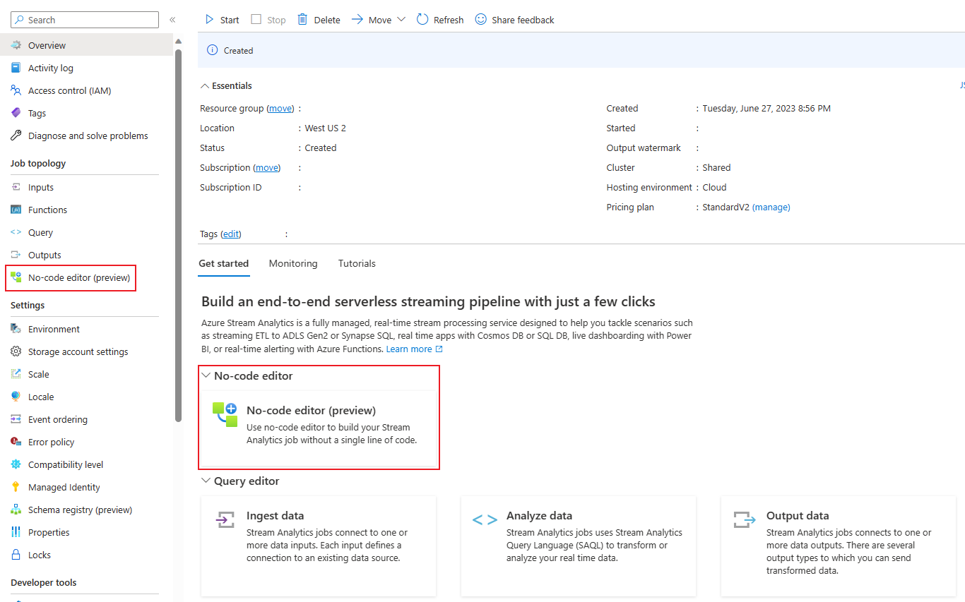 Through Azure Stream Analytics portal (preview): Create a Stream Analytics job, and then select the no-code editor in the Get started tab in Overview page, or select No-code editor in the left panel.