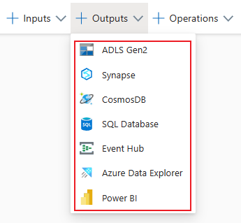 - The following output types are not available: Azure Function, ADLS Gen1, PostgreSQL DB, Service Bus queue/topic, Table storage.