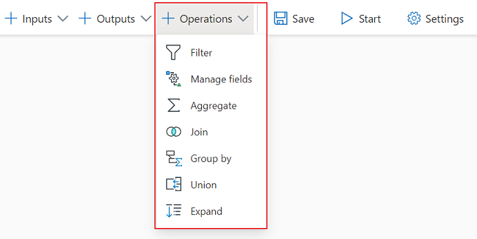 To add a streaming data transformation to your job, select the transformation symbol under the Operations section on the ribbon for that transformation. The respective tile will be dropped in the diagram view. After you select it, you'll see the side pane for that transformation to configure it.
