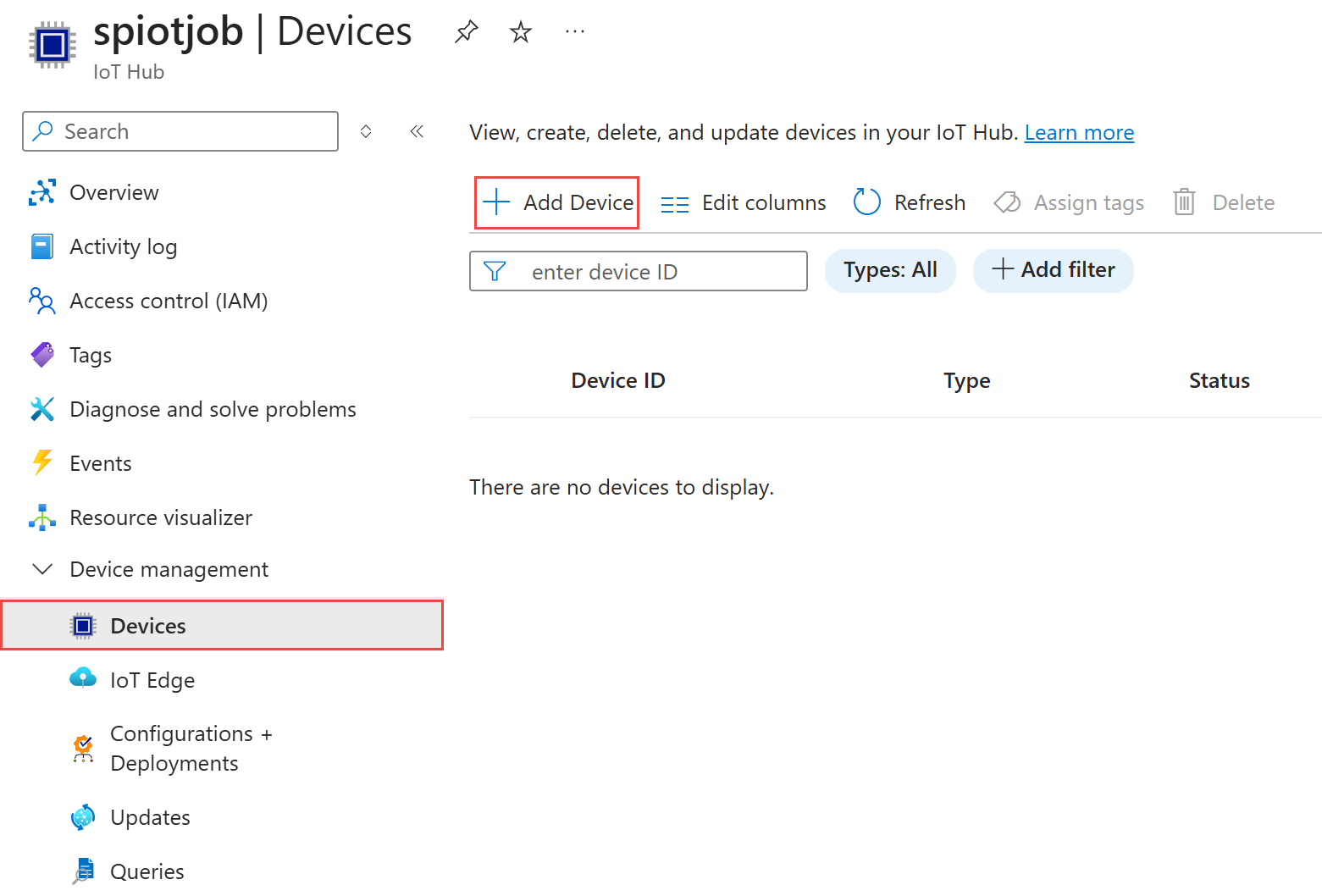 6. On the IoT Hub page, select Devices on the left menu, and then select + Add device.