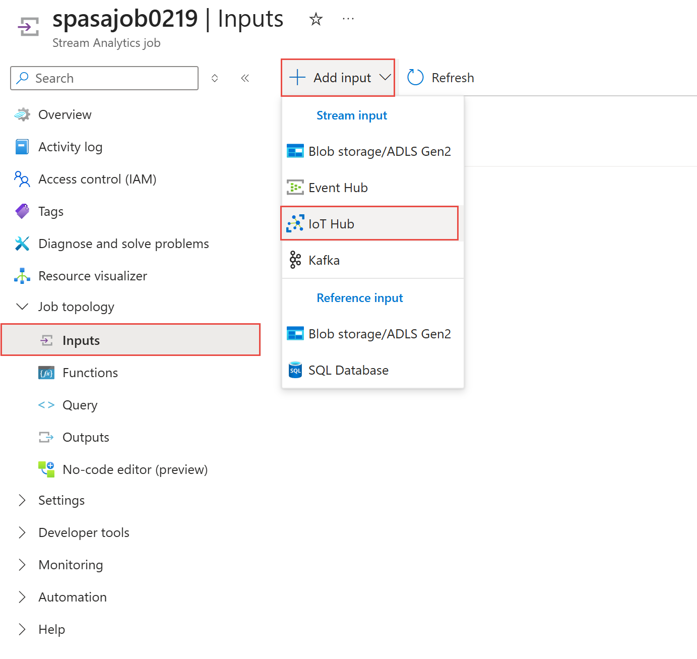 1. On the Stream Analytics job page, select Inputs under Job topology in the left menu.