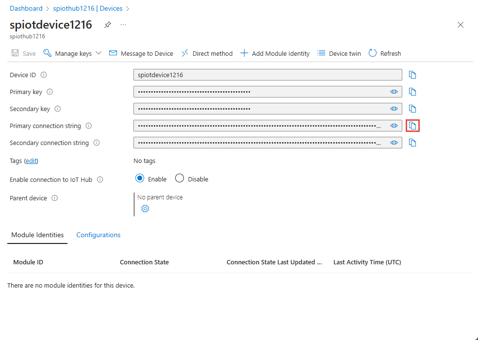 10. On the device page, select the copy button next to Primary Connection String, and save it to a notepad to use later.