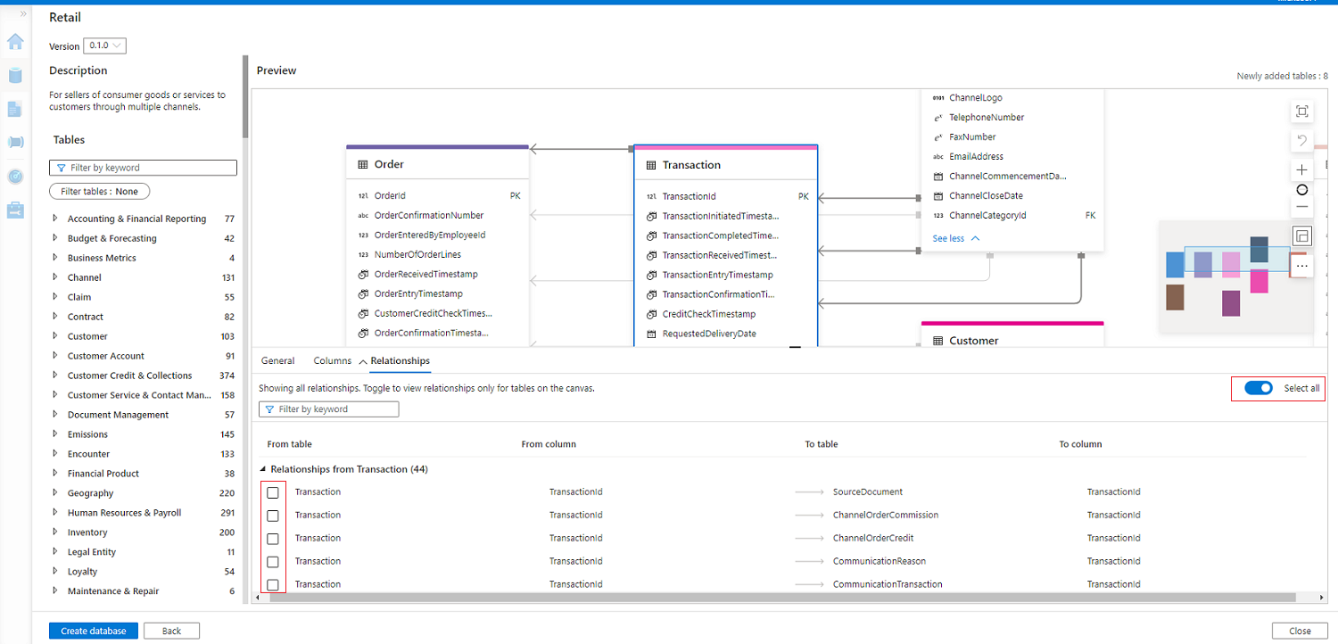 Once the canvas has all the tables that meet your requirements, select Create database to continue with creation of lake database. The new database will show up in the database designer and you can customize it per your business needs.