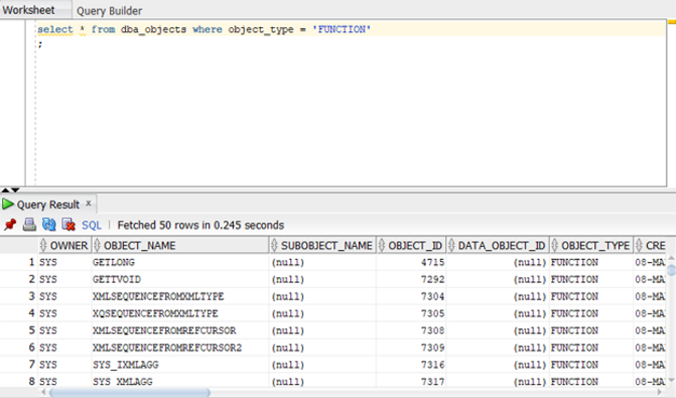 Most modern database products support storing procedures within the database. Oracle provides the PL/SQL language for this purpose. A stored procedure typically contains both SQL statements and procedural logic, and returns data or a status. You can get a list of stored procedures within an Oracle database by querying the ALL_OBJECTS view with the appropriate WHERE clause. You can use Oracle SQL Developer to get a list of stored procedures, as shown in the next screenshot.