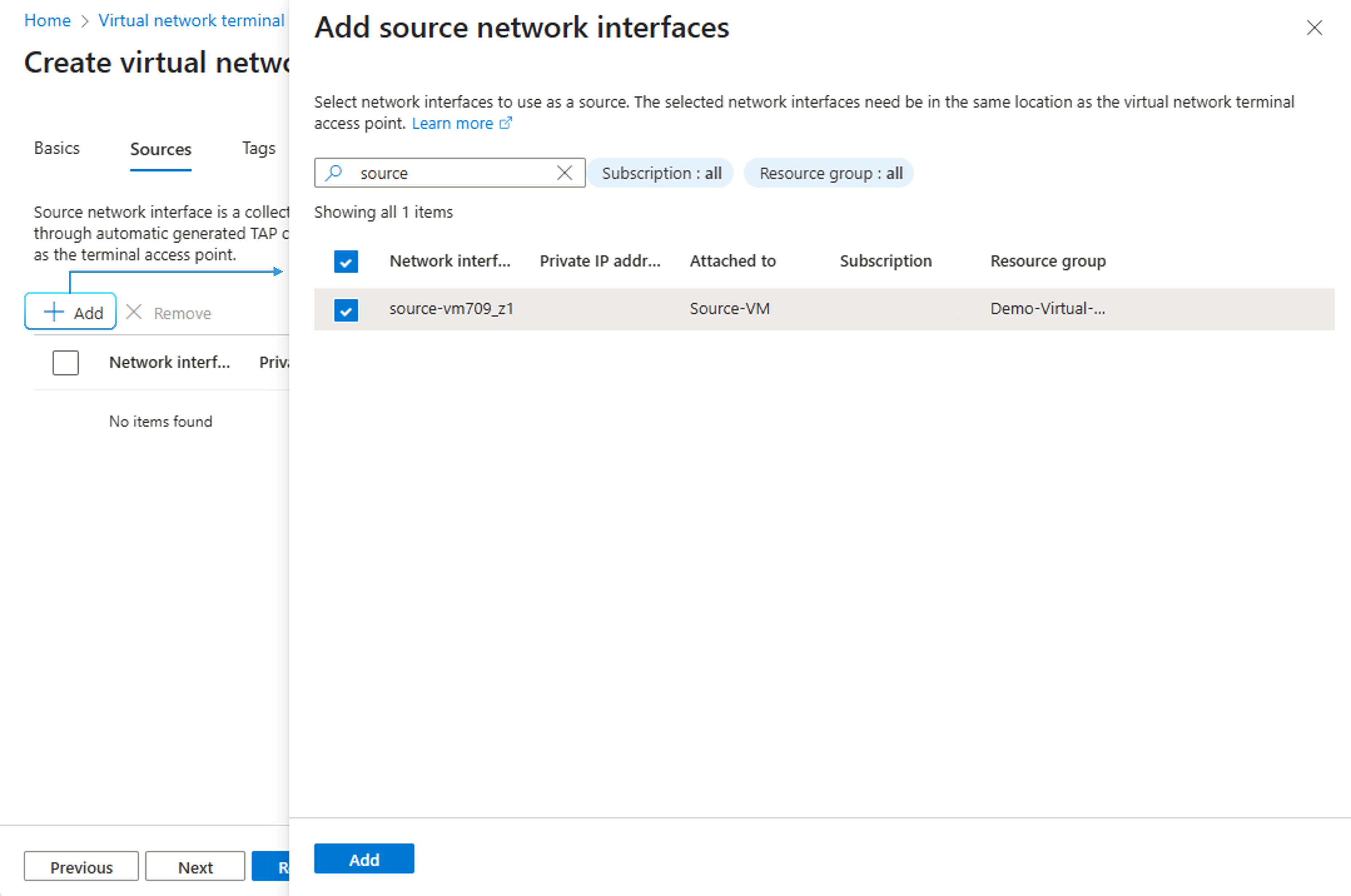 - After you specify your destination resource, click Select to open the Add source network interfaces page.