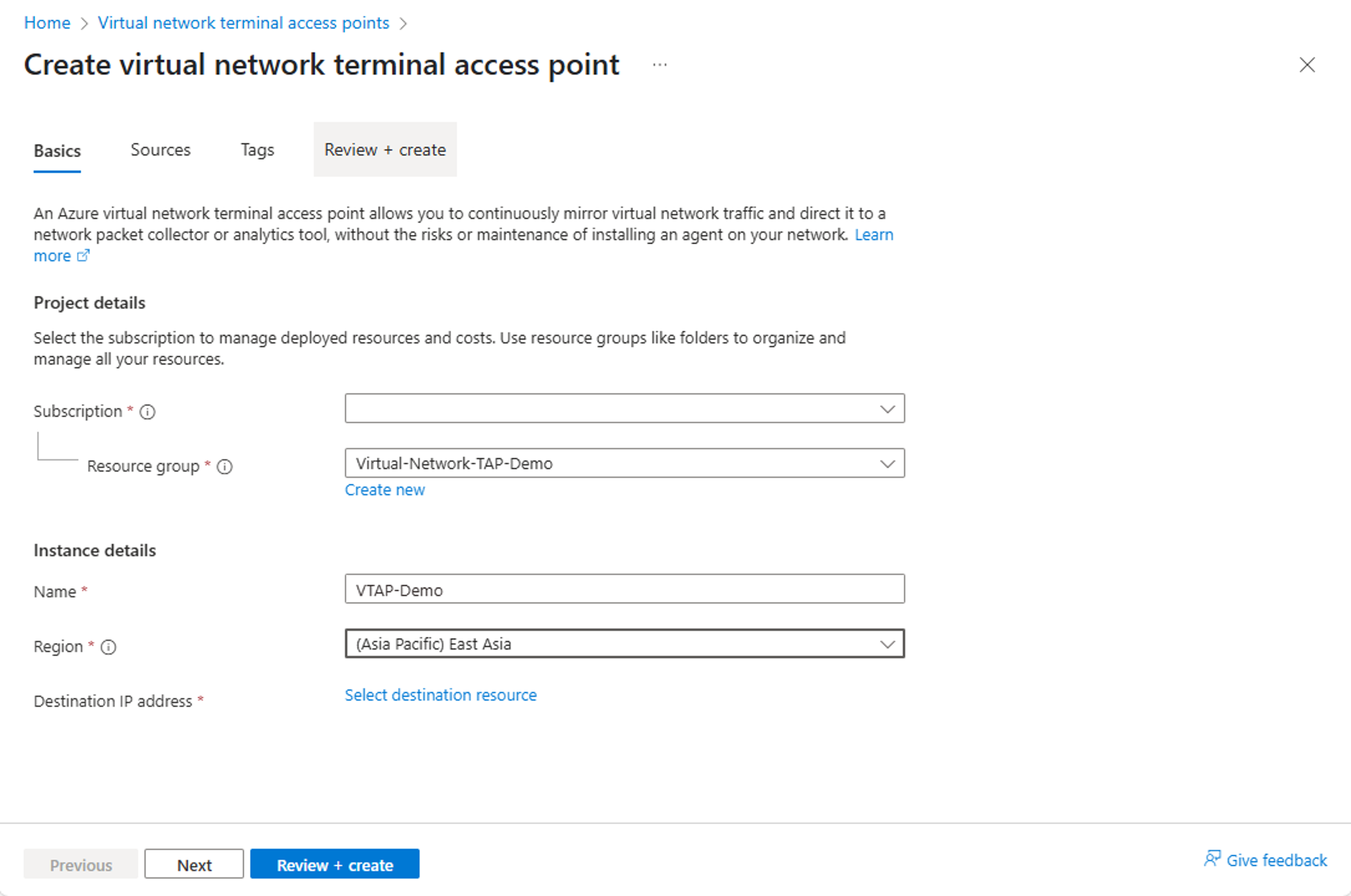 - Click Review and Create to deploy your virtual network TAP resource.
