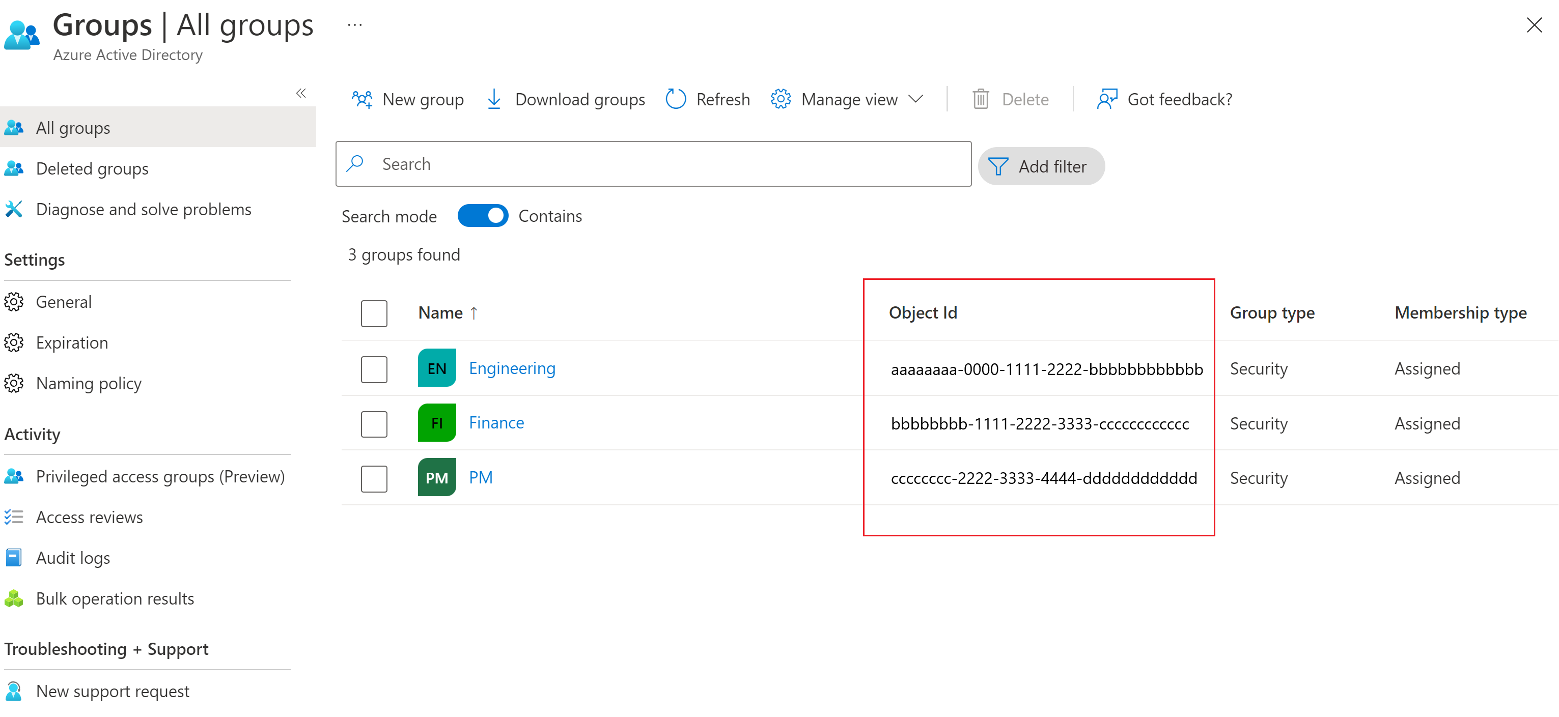 | Yes | 0 | Engineering | Microsoft Entra ID | groupObjectId1 |