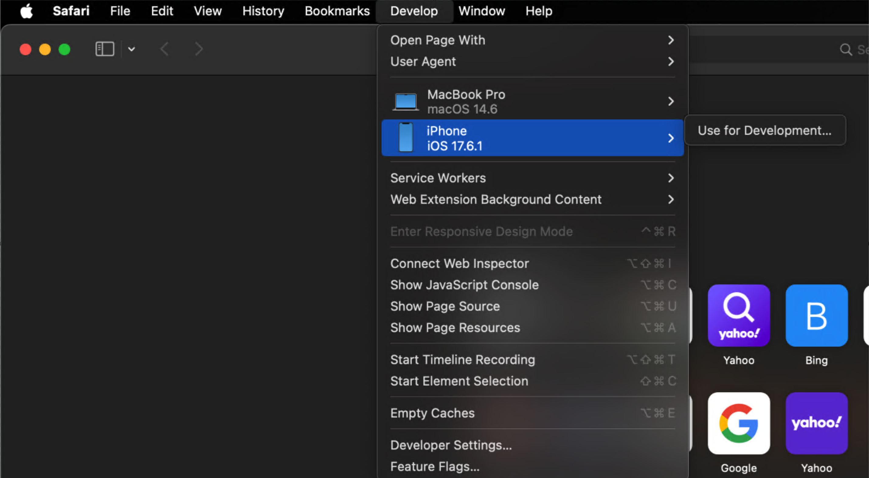 5. From the Safari's Develop menu on the Mac system, select Use for Development... for your iOS client. This is a one-time setting that you configure the first time you use Safari to access DevTools for the iOS client.