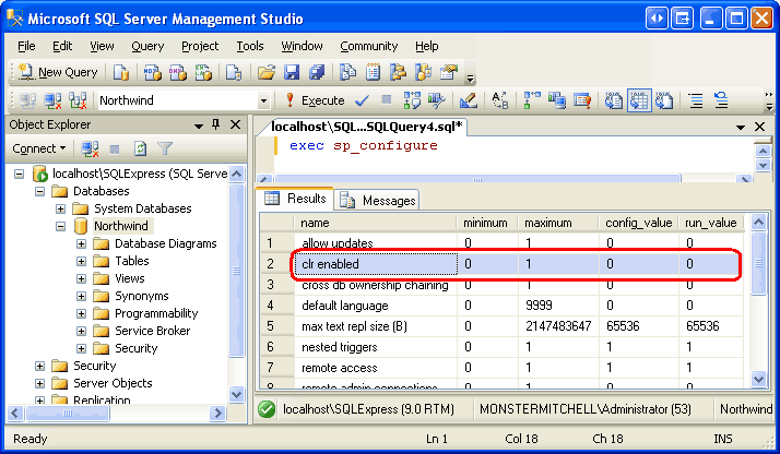 To examine the Northwind database s configuration information, enter and execute the command exec sp_configure in the query window. This shows that the clr enabled setting is currently set to 0.