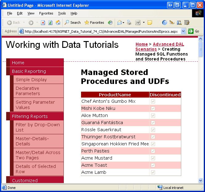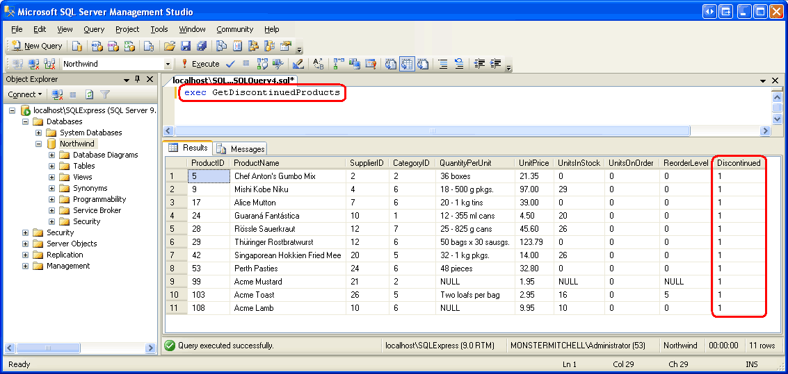 Figure 13: The GetDiscontinuedProducts Stored Procedure Returns All Discontinued Products (Click to view full-size image)