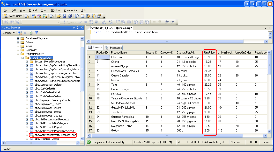 After executing the above script, refresh the Stored Procedures folder in the Object Explorer. You should see a new stored procedure entry - GetProductsWithPriceGreaterThan - which has a lock icon next to it. To test this stored procedure, enter and execute the following script in the query window: