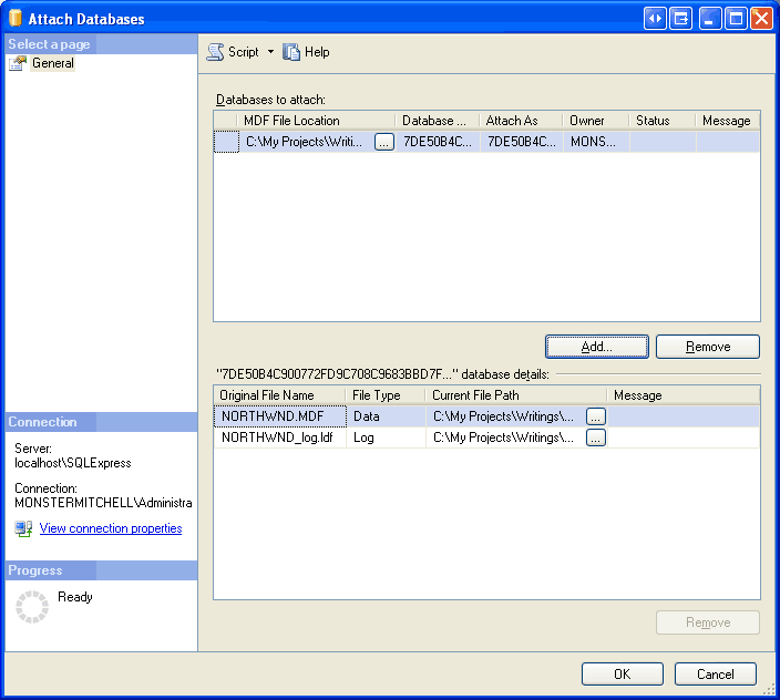 We need to attach the Northwind database in the DataFiles folder (or wherever you may have moved it) to the SQL Server 2005 Express Edition database instance. Right-click on the Databases folder and choose the Attach option from the context menu. This will bring up the Attach Databases dialog box. Click the Add button, drill down to the appropriate NORTHWND.MDF file, and click OK. At this point your screen should look similar to Figure 2.