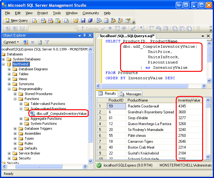 The udf_ComputeInventoryValue and udf_GetProductsByCategoryID UDFs created in the above examples are T-SQL database objects. SQL Server 2005 also supports managed UDFs, which can be added to the ManagedDatabaseConstructs project just like the managed stored procedures from Steps 3 and 5. For this step, let s implement the udf_ComputeInventoryValue UDF in managed code.