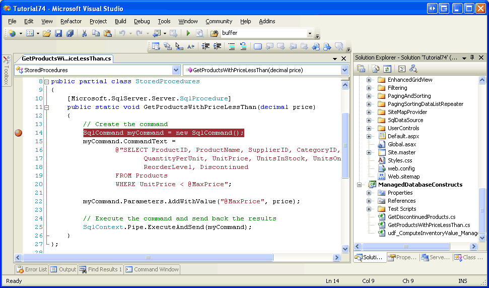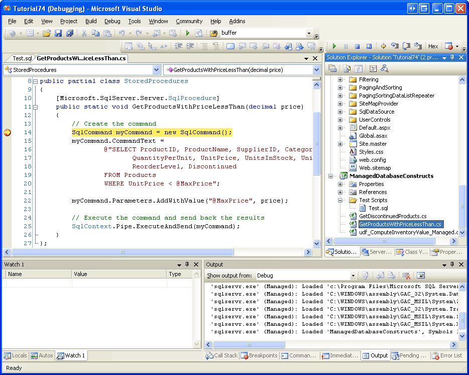 Once you ve entered the above script into Test.sql, start debugging by going to the Debug menu and choosing Start Debugging or by hitting F5 or the green play icon in the Toolbar. This will build the projects within the Solution, deploy the managed database objects to the Northwind database, and then execute the Test.sql script. At this point, the breakpoint will be hit and we can step through the GetProductsWithPriceLessThan method, examine the values of the input parameters, and so on.