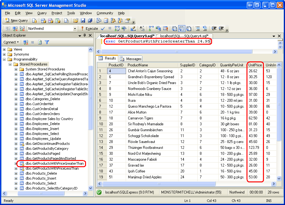 This creates a new stored procedure in the Northwind database named GetProductsWithPriceGreaterThan and associates it with the managed method GetProductsWithPriceGreaterThan (which is in the class StoredProcedures, which is in the assembly ManuallyCreatedDBObjects).