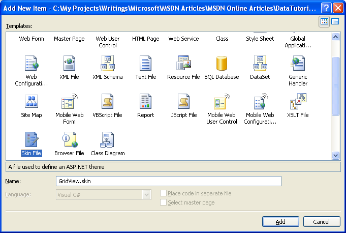 Start by adding a new Skin File to your project named GridView.skin by right-clicking on the project name in the Solution Explorer and choosing Add New Item.