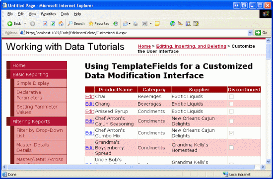 Currently the products' Discontinued data field is expressed using a CheckBoxField, which renders a disabled checkbox for the read-only rows and an enabled checkbox for the row being edited. While this user interface is often suitable, we can customize it if needed using a TemplateField. For this tutorial, let's change the CheckBoxField into a TemplateField that uses a RadioButtonList control with two options "Active" and "Discontinued" from which the user can specify the product's Discontinued value.