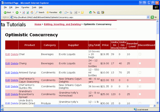 From the end user's perspective, clicking on the Delete button for Chai Tea in the second browser window caused the screen to flash and, upon coming back, the product is still there, although now it's listed as "Chai" (the product name change made by the first browser instance). If the user clicks the Delete button again, the Delete will succeed, as the GridView's original ProductName value ("Chai") now matches up with the value in the database.