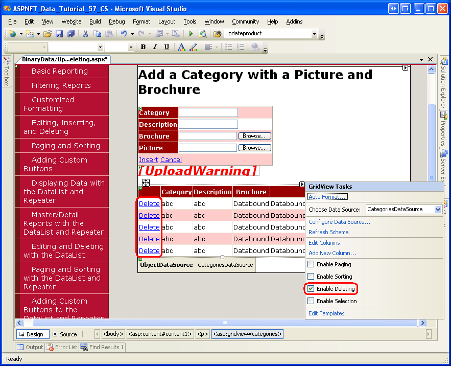 In the preceding tutorial we created a page named UploadInDetailsView.aspx that listed all categories in a GridView and provided a DetailsView to add new categories to the system. In this tutorial we will extend the GridView to include editing and deleting support. Rather than continuing to work from UploadInDetailsView.aspx, let s instead place this tutorial s changes in the UpdatingAndDeleting.aspx page from the same folder, ~/BinaryData. Copy and paste the declarative markup and code from UploadInDetailsView.aspx to UpdatingAndDeleting.aspx.