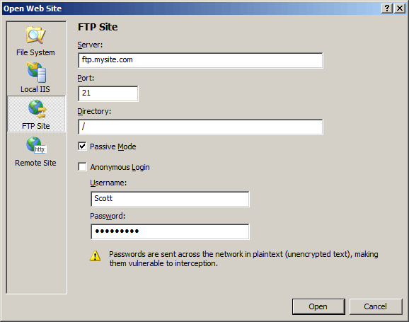 In order to deploy our site we need to first connect to the web host provider. Click the Connect button at the top of the Copy Web Site user interface. This displays the Open Web Site dialog box shown in Figure 2.