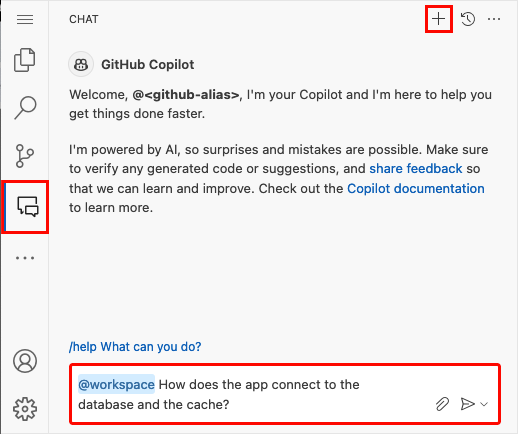 You might have noticed that the GitHub Copilot chat view was already there for you when you created the codespace. For your convenience, we include the GitHub Copilot chat extension in the container definition (see .devcontainer/devcontainer.json). However, you need a GitHub Copilot account (30-day free trial available).