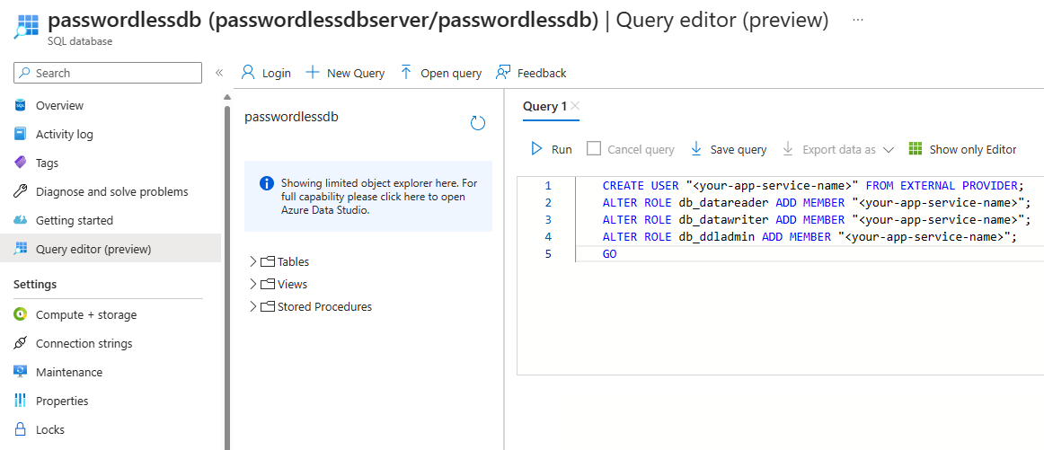 Microsoft.Data.SqlClientlibrary included in your app automatically discovers the managed identity, just like it discovered your local Visual Studio user. - Create a SQL database user and associate it with the App Service managed identity.