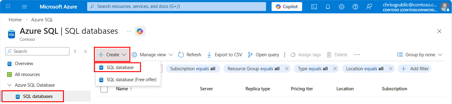 In the resource menu, expand Azure SQL Database and select SQL databases.