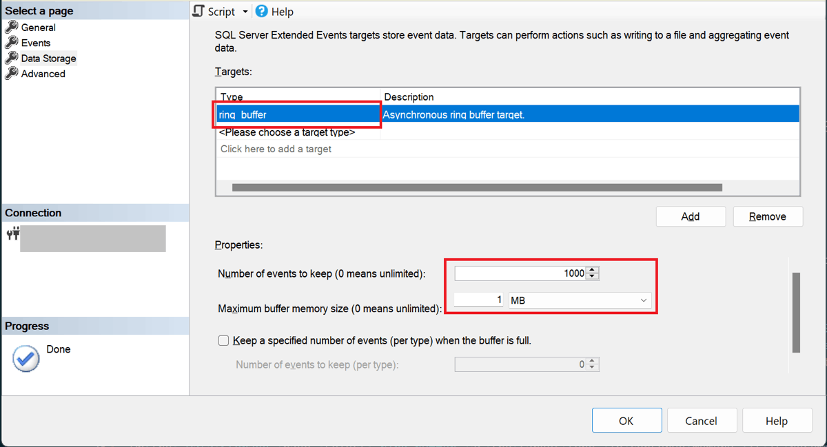 On the Data Storage page, select ring_buffer as the target type. To conserve memory, we recommend that you keep the number of events to a small number (1,000 by default), and to set the maximum buffer memory to 1 MB or less. For details, see ring_buffer target.